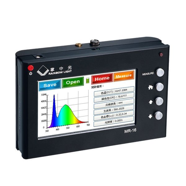 Portable Spectrometer with Display , the first CCD spectrometer in the world. Portable light and color meter free from connecting with computer. This light meter can capture and visible light source and to operate the device through touch panel instinctively, instant spectrum and data available. Several models available, such as PPF and LED BINS. Micro-spectrometer is the core of portable light meter. Its high stability and accuracy provide diversified application. Features First CCD spectrometer in the world, that free from connecting with computer 4.3 inch colorful touch screen Just aims at the light source, and click “measure” to test User-friendly Multi-functional interface Specification   Resolution: 4.2 - 5 nm FWHM  Wavelength Range: 380 – 780 nm Signal-to-noise Range: 0.3 % Spectral deviation: 0.12 % Integration Time: 1 ms – 24 s Input Fiber Connector: SMA905 Interface: USB Power: Rechargeable Li-ion Battery Screen: 4.3 inch touch / colorful screen Storage Media: Micro-SD Memory Card Dimensions: 148.5(W) x 96(D) x 34.5(H) mm Weight: 550 g Design / Made in Taiwan Model Specification \...